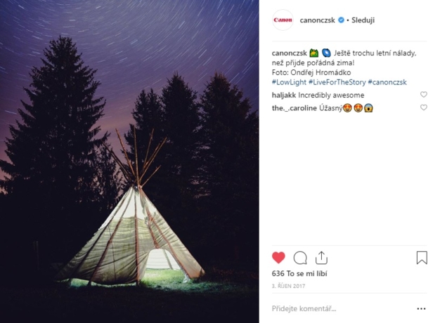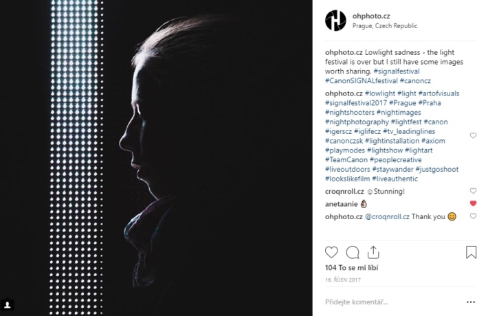 V říjnu 2018 jsem měl tu čest být v rámci Signal light festivalu a současně pořádané soutěže #CanonLowlight jedním z Canon ambasadorů a tvůrců obsahu. Má fotografie byla použita jako úvodní fotografie na letáčcích informující o Canon technice během festivalu. Současně s ní bylo použito i několik dalších za účelem propagace soutěže i facebookové stránky Canon CZ. V rámci Signal festivalu jsem se účastnil i Canon instameetu, kde jsem dostal možnost vyzkoušet si novinku Canon 6D mark II. Po dobu festivalu jsem na svém instagramovém účtu sdílel příspěvky propagující jak Signal festival jehož partnerem Canon byl tak soutěžní hashtag.